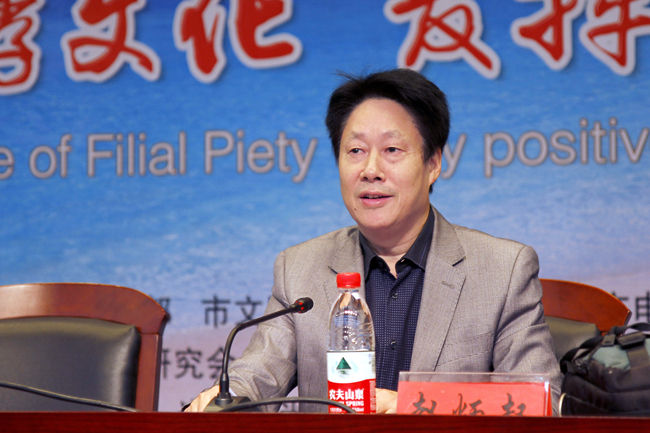 赵炳起在欢迎辞中对各位来宾表示欢迎,并简要介绍了学校基本情况和创建江苏海洋大学三年行动纲要。他指出,建成一所综合性有特色的大学,必须要有一个厚重而强大的文科作为支撑,作为地方高校的文科建设,必须深深扎根于连云港历史文化这片沃土,从中汲取丰厚的营养,寻找我们服务的方向和重点。来自北京、重庆、浙江和山东等地的专家学者,与我们本地孝文化研究会的同仁,选择重阳敬老日,在淮海工学院研讨孝文化,弘扬孝文化。这既是全市宣传文化系统的一件大事,也是我们淮海工学院发挥大学文化传承创新职能、助推地方文化建设的一件盛事。他希望各位专家高举中国特色社会主义伟大旗帜,根植我们深厚的中华优秀传统文化,放眼全球伦理发展的世界潮流,从科学理论和行为规范上研究提升中华孝文化的核心本质、具体内涵和现代价值认同。