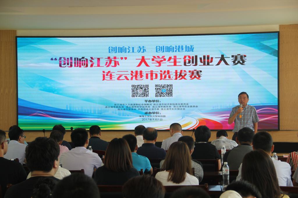 9月1日,2017“创响江苏”大学生创业大赛连云港市选拔赛在淮海工学院诚意楼报告厅举行。本次活动由连云港市人社局等9家单位主办,淮海工学院大学科技园承办。在连高校、大学生创业园区、县区人社部门负责同志等代表100多人现场观摩。