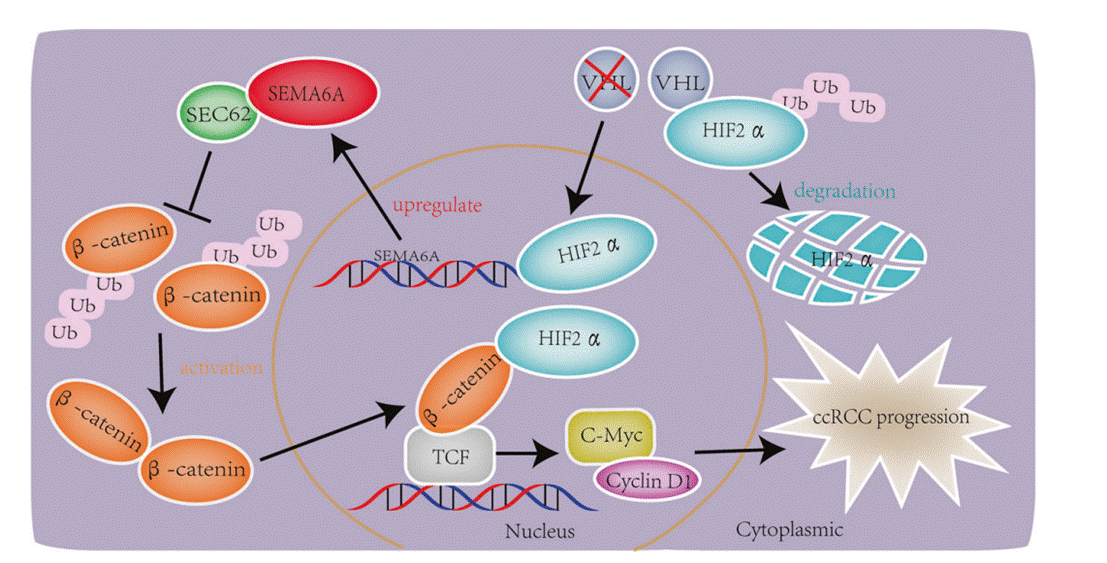 研究进一步发现,SEMA6A通过增强SEC62和β-catenin的相互作用,抑制了β-catenin蛋白的泛素化降解,维护了其稳定性和活性,从而促进了Wnt/β-catenin通路的激活,对肾透明细胞癌产生了加速作用(图3)。