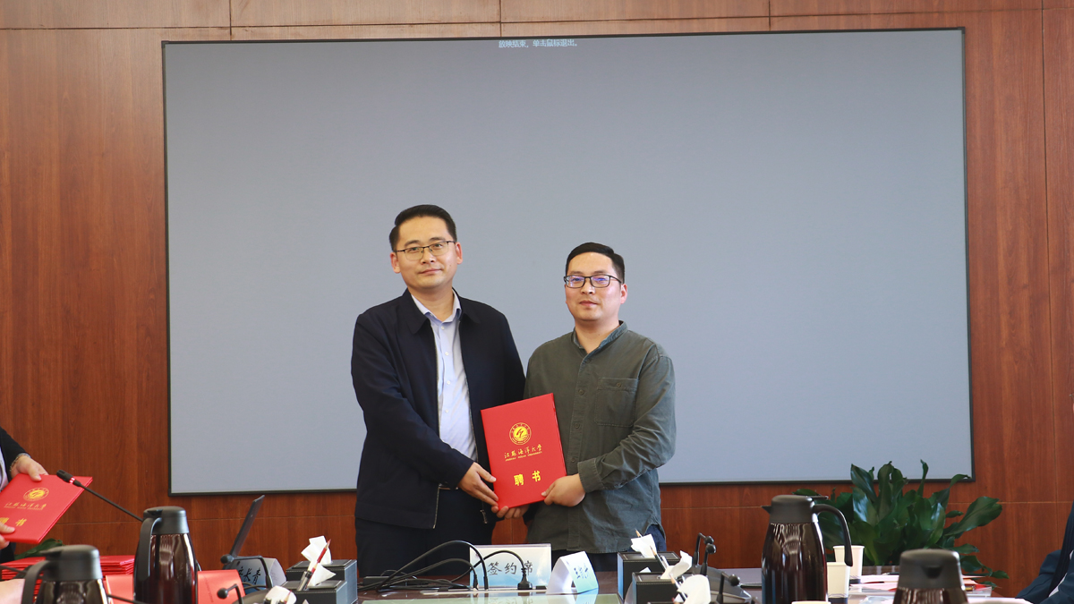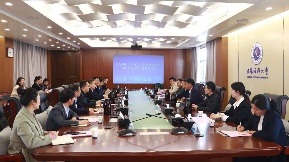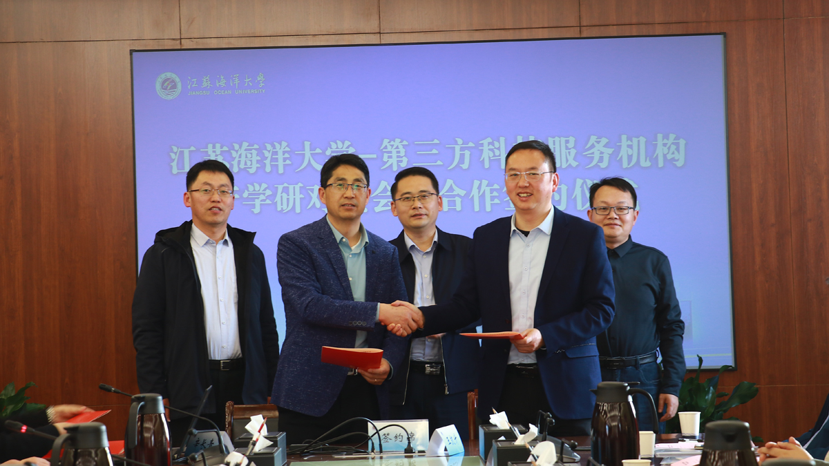 科学技术处副处长房耀维代表学校与江苏火石科技有限公司、江苏海宿汇技术转移有限公司、聚明数据(南京)有限公司、 宿迁嵘锦信息科技有限公司、连云港芯科信息科技有限公司、连云港乐诚信息科技有限公司等十家省内科技服务机构的负责人签订了《校企合作协议》。申欣副校长向选聘的科技服务机构颁发了江苏海洋大第三方科技服务机构聘书。