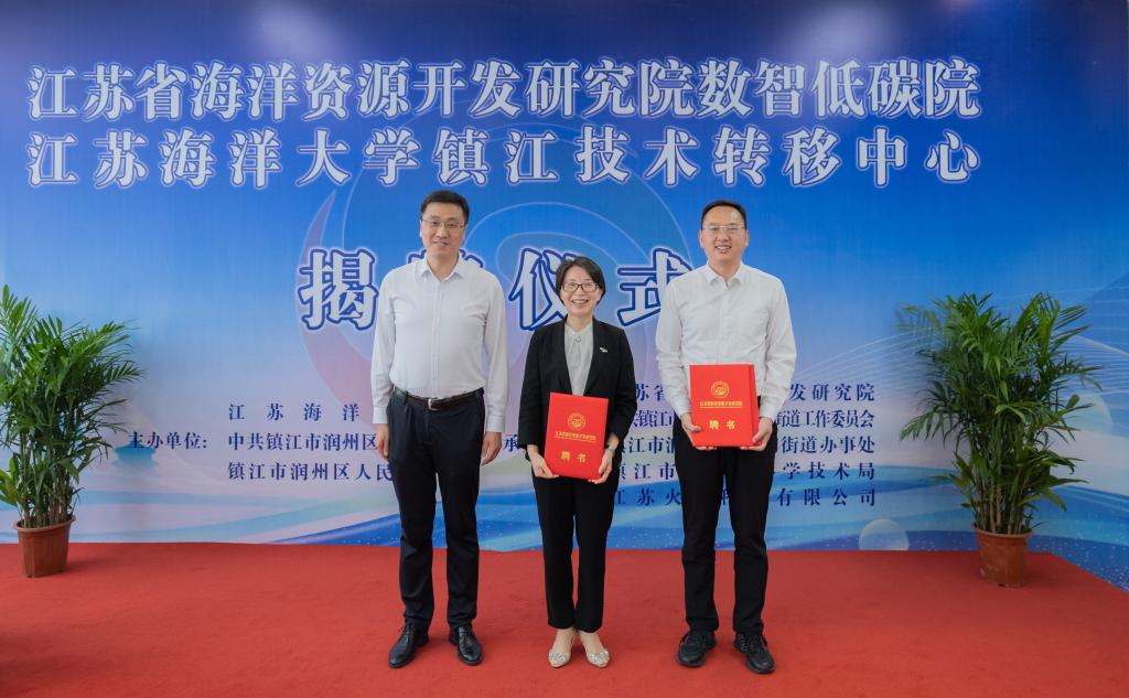 润州区委常委、副区长朱明为新任江苏省海洋资源开发研究院——数智低碳院院长、江苏省海洋资源开发研究院副院长李妍和新任数智低碳院副院长兼江苏海洋大学镇江技术转移中心主任、江苏火石科技有限公司总经理、校友周华颁发聘书。