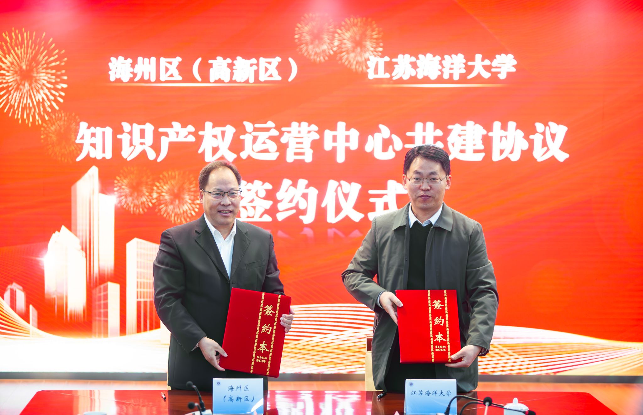 海州区市场监督管理局局长、知识产权局局长陈贤斌和我校戴红伟代表双方签订《海州区知识产权局―江苏海洋大学知识产权运营中心共建协议》。