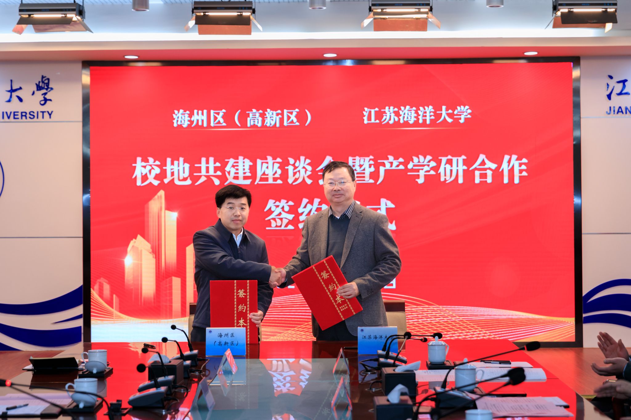 宁晓明与朱伟哲代表双方签订《海州区人民政府―江苏海洋大学产学研合作协议》。