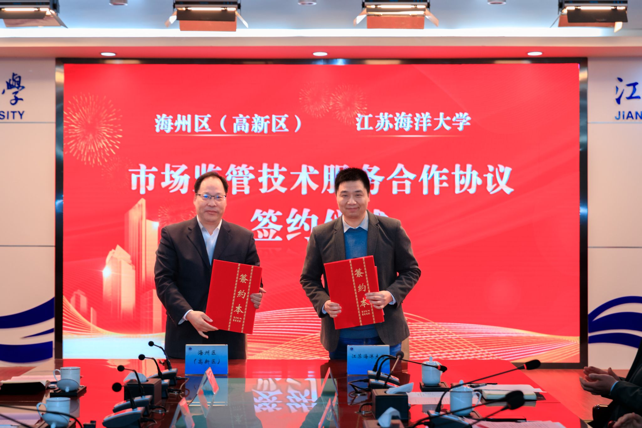 陈贤斌和我校药学院主持工作副院长刘彬代表双方签订《海州区市场监督管理局―江苏海洋大学技术服务合作协议》。