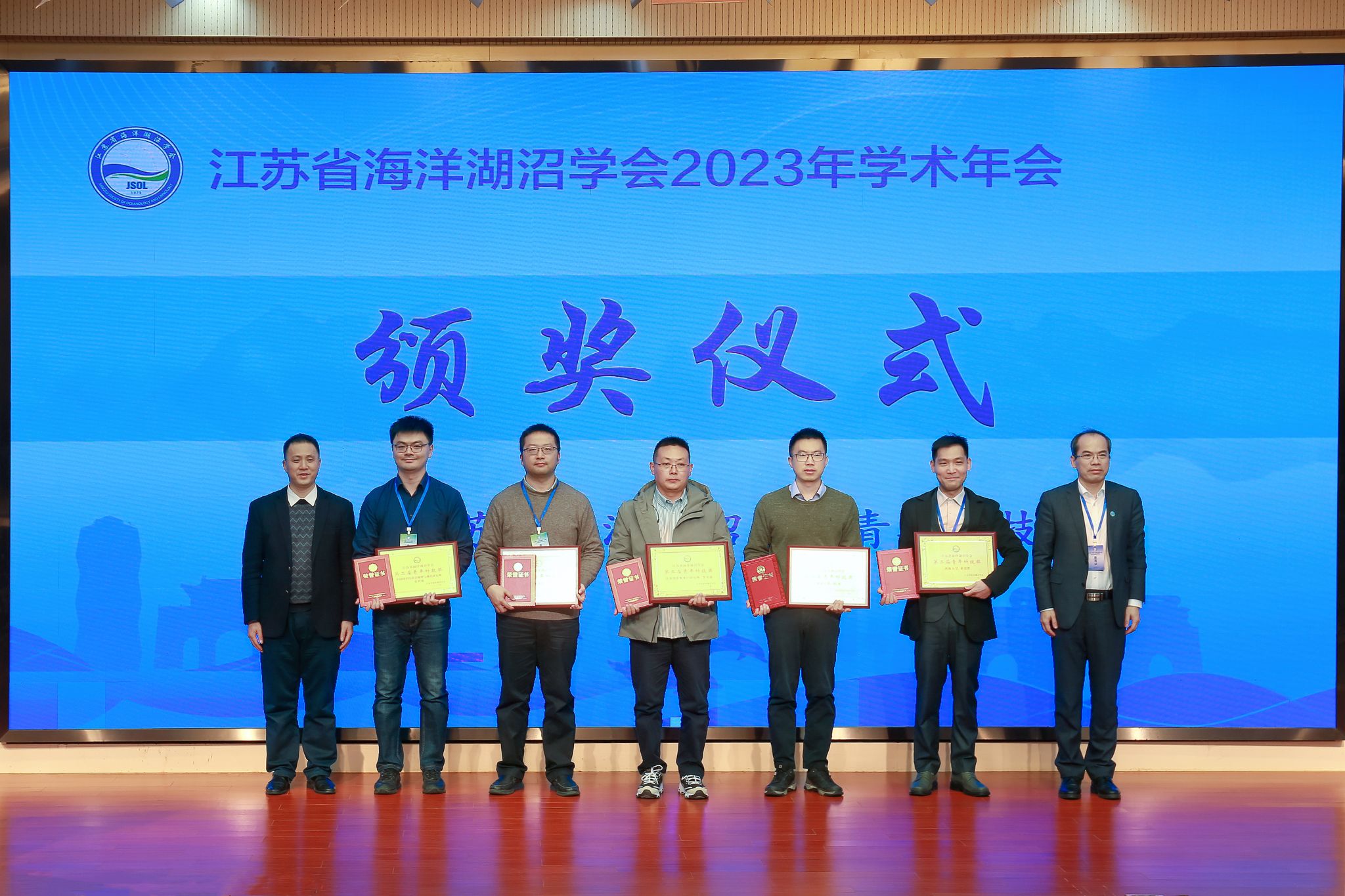 副校长申欣主持学会青年科学技术奖颁奖仪式,并宣读第二届江苏省海洋湖沼学会青年科学技术奖表彰决定。学会理事长郑金海、副理事长张运林向5位获奖者颁发了奖牌及荣誉证书。