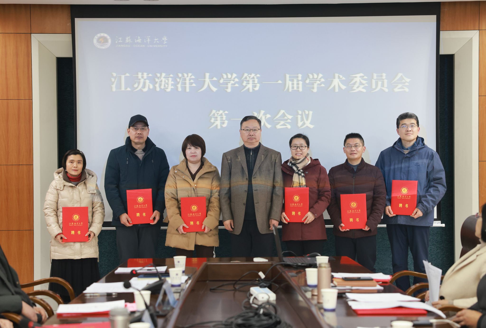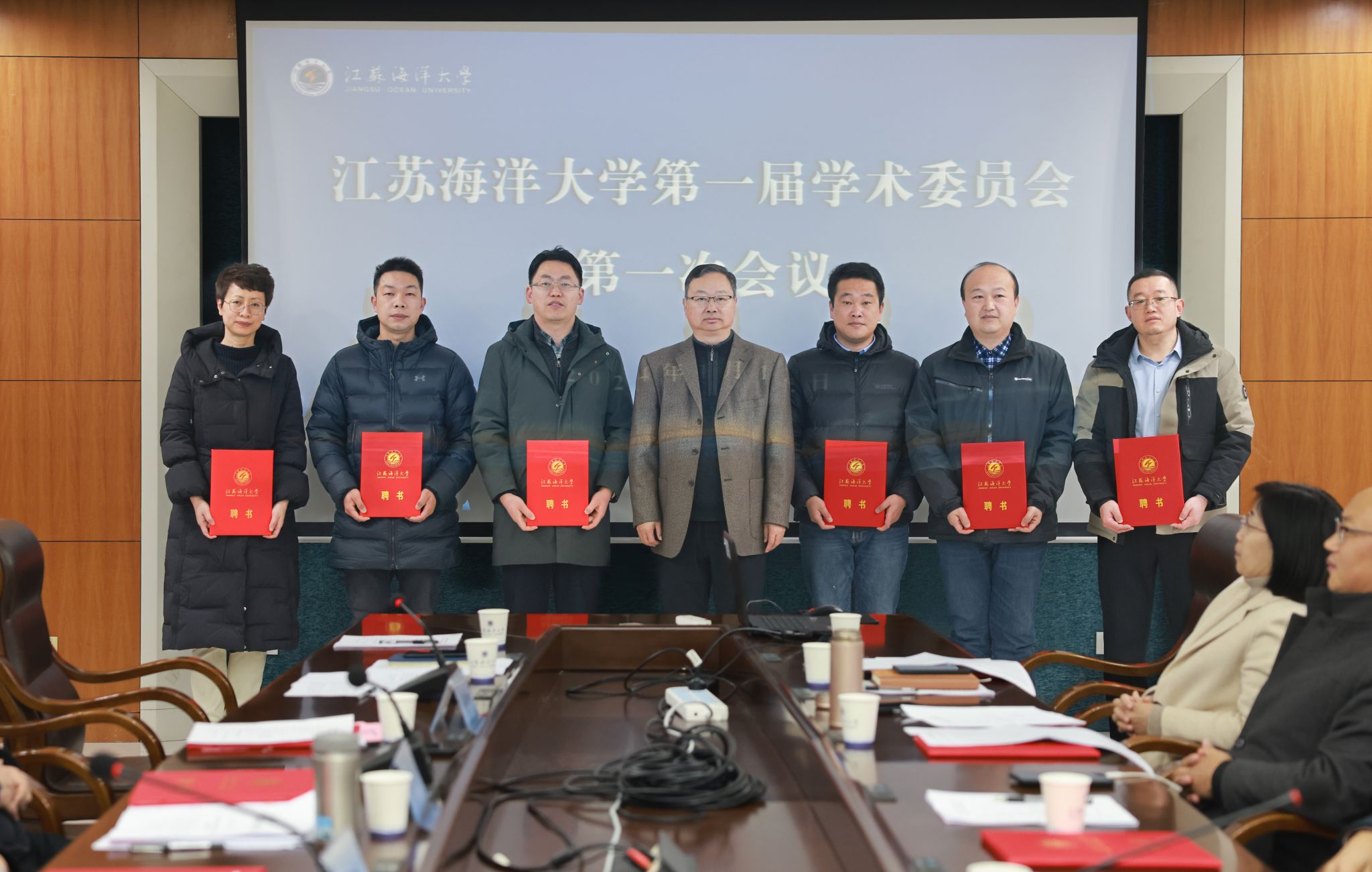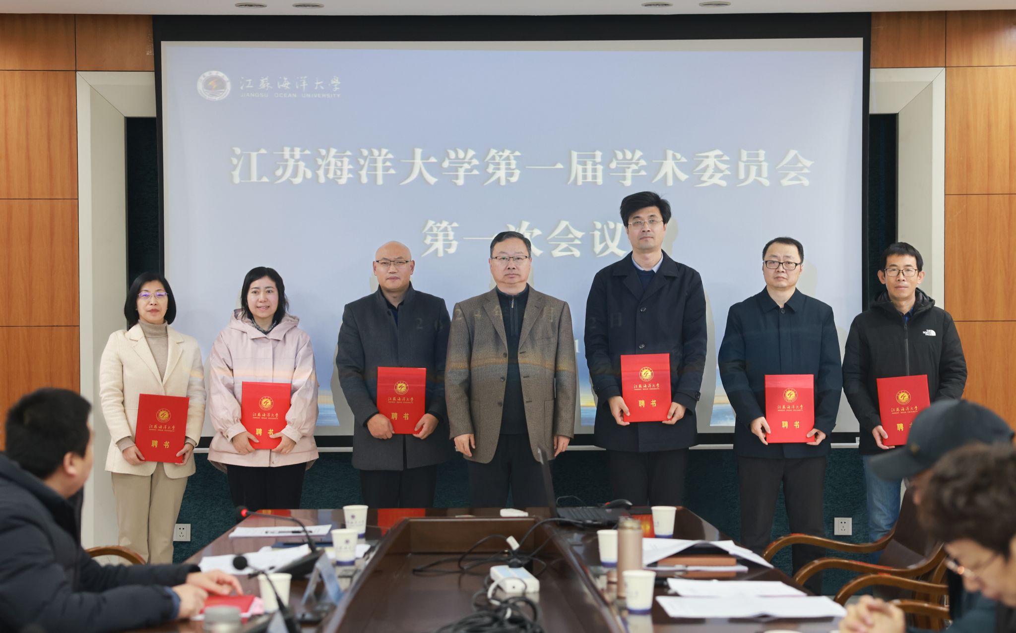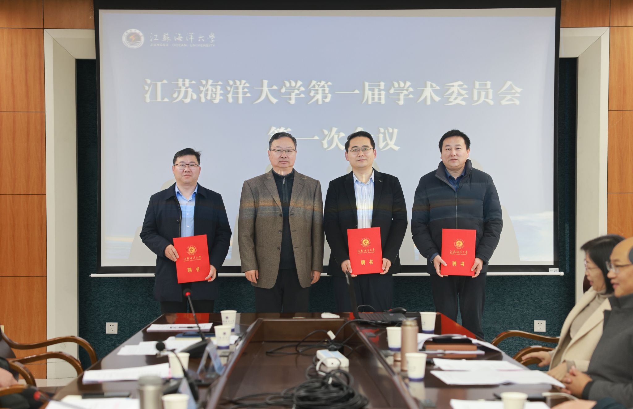 江苏海洋大学第一届学术委员会主任委员宁晓明分别向副主任委员申欣、马廷淮、徐军田,以及与会18名委员颁发了聘书。