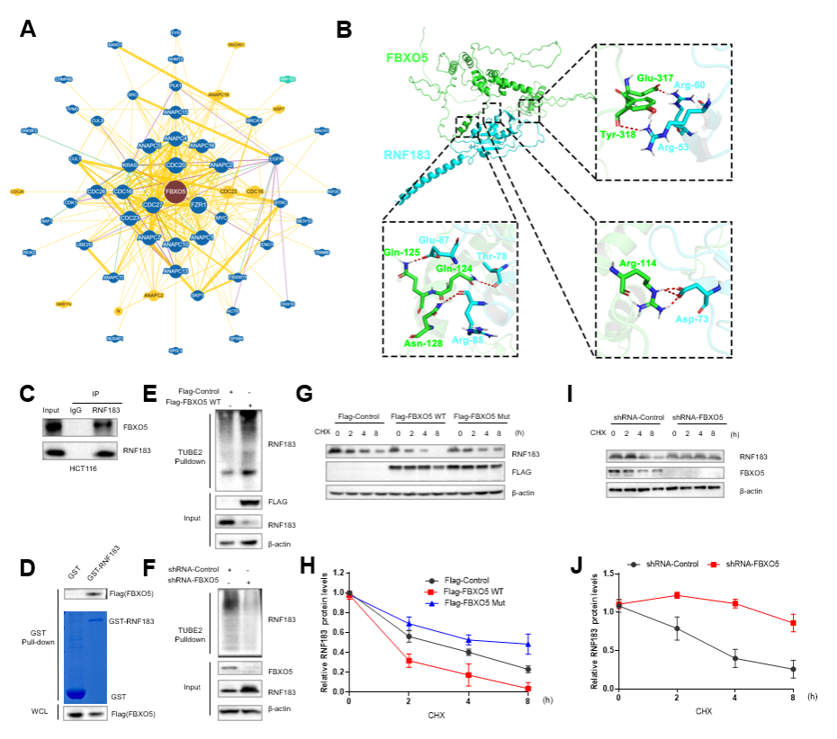 FBXO5是如何促进结肠癌发生发展的?研究团队进一步通过BioGRID数据库互作蛋白分析、分子对接模拟等实验,发现了FBXO5的潜在相互作用蛋白RNF183,随后通过co-IP、内源性IP、蛋白半衰期等实验验证了FBXO5具有与RNF183结合并调节其泛素化和稳定性的能力,最后通过RNA干扰技术结合裸鼠成瘤、细胞克隆等体内外实验证实FBXO5通过泛素化降解RNF183发挥促进肿瘤作用,阐明FBXO5促进结肠癌发生发展的分子机制。