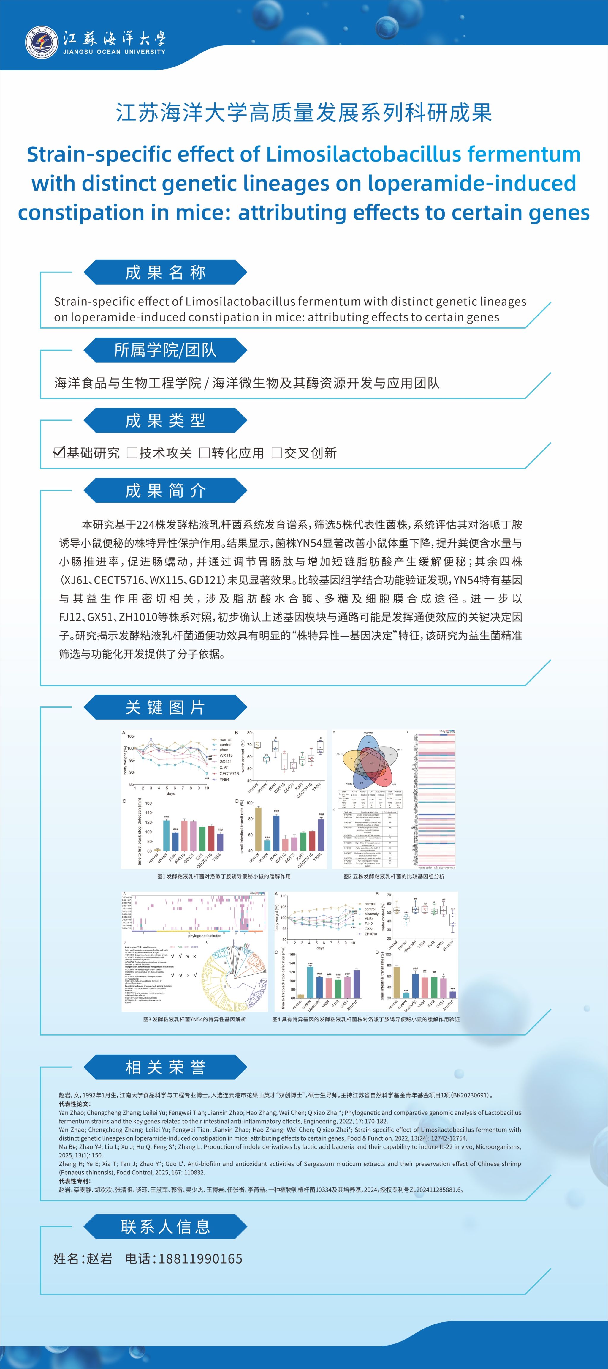 【成果名称】:Strain-specific effect of Limosilactobacillus fermentum with distinct genetic lineages on loperamide-induced constipation in mice: attributing effects to certain genes