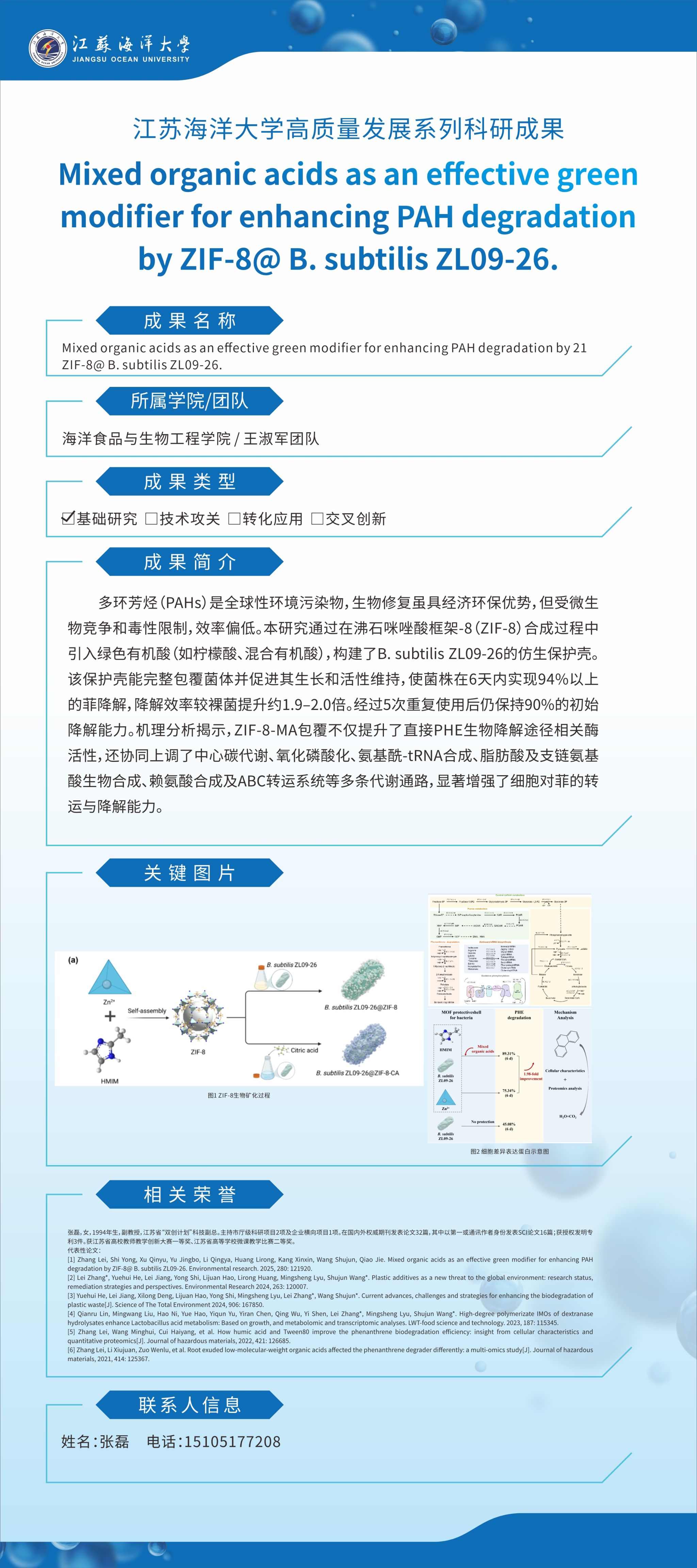 【成果名称】:Mixed organic acids as an effective green modifier for enhancing PAH degradation by ZIF-8@ B. subtilis ZL09-26.