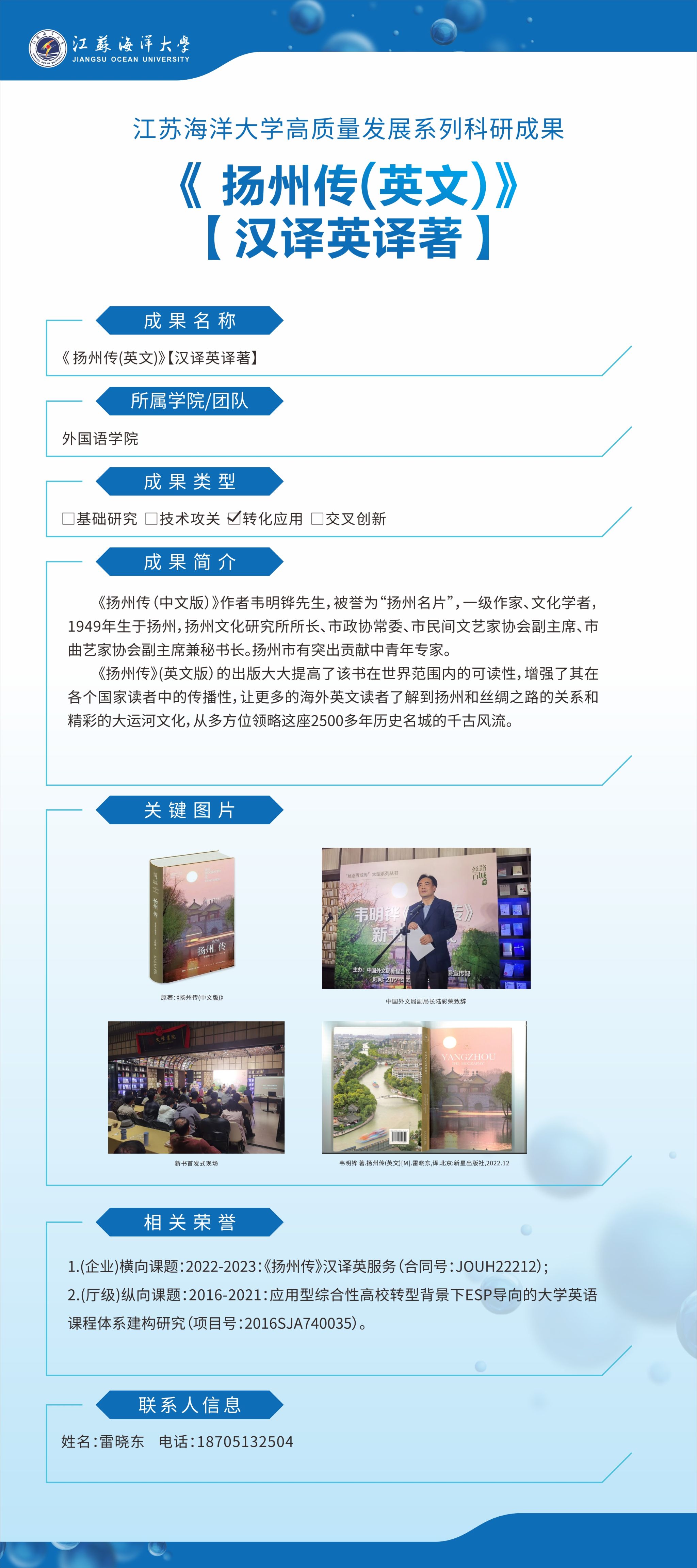【成果名称】:《 扬州传(英文)》【汉译英译著】