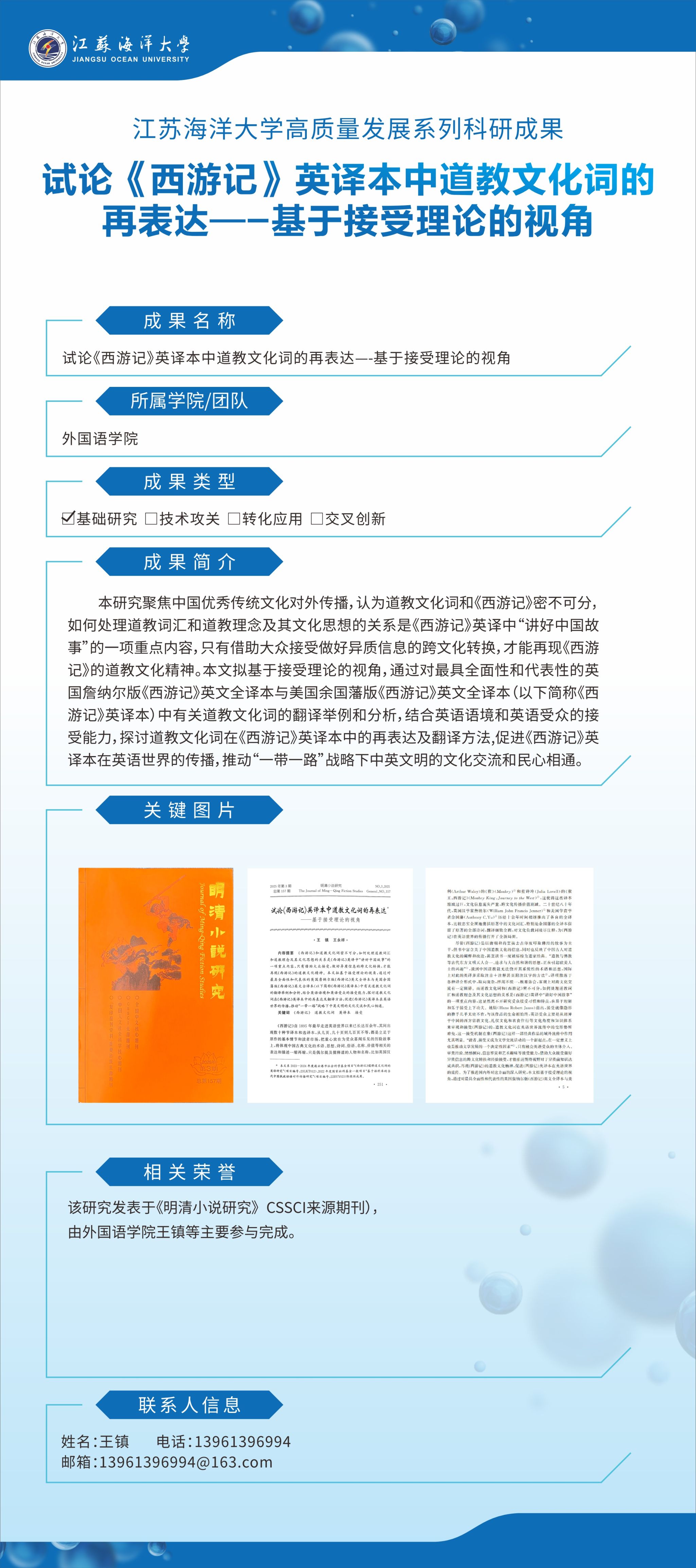 【成果名称】:试论《西游记》英译本中道教文化词的再表达——基于接受理论的视角