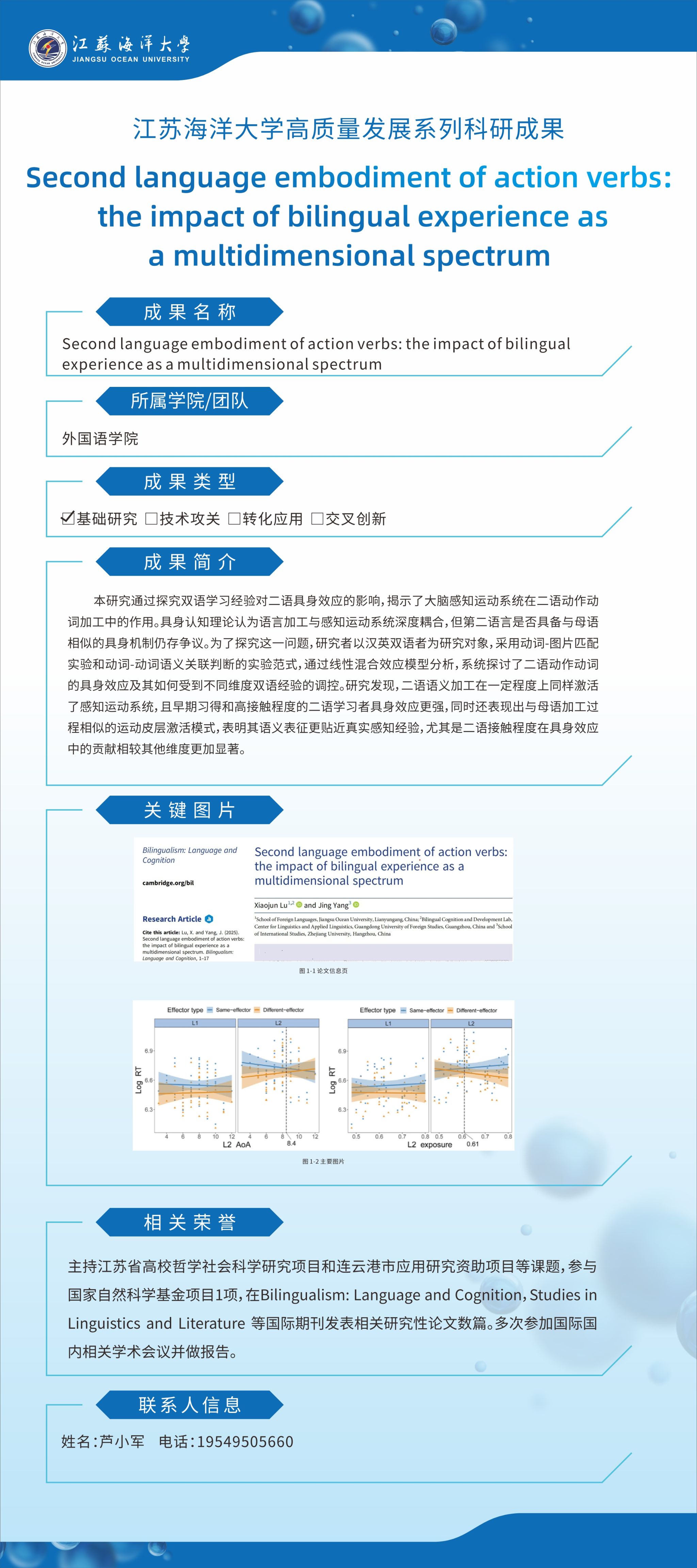 【成果名称】:Second language embodiment of action verbs: the impact of bilingual experience as a multidimensional spectrum