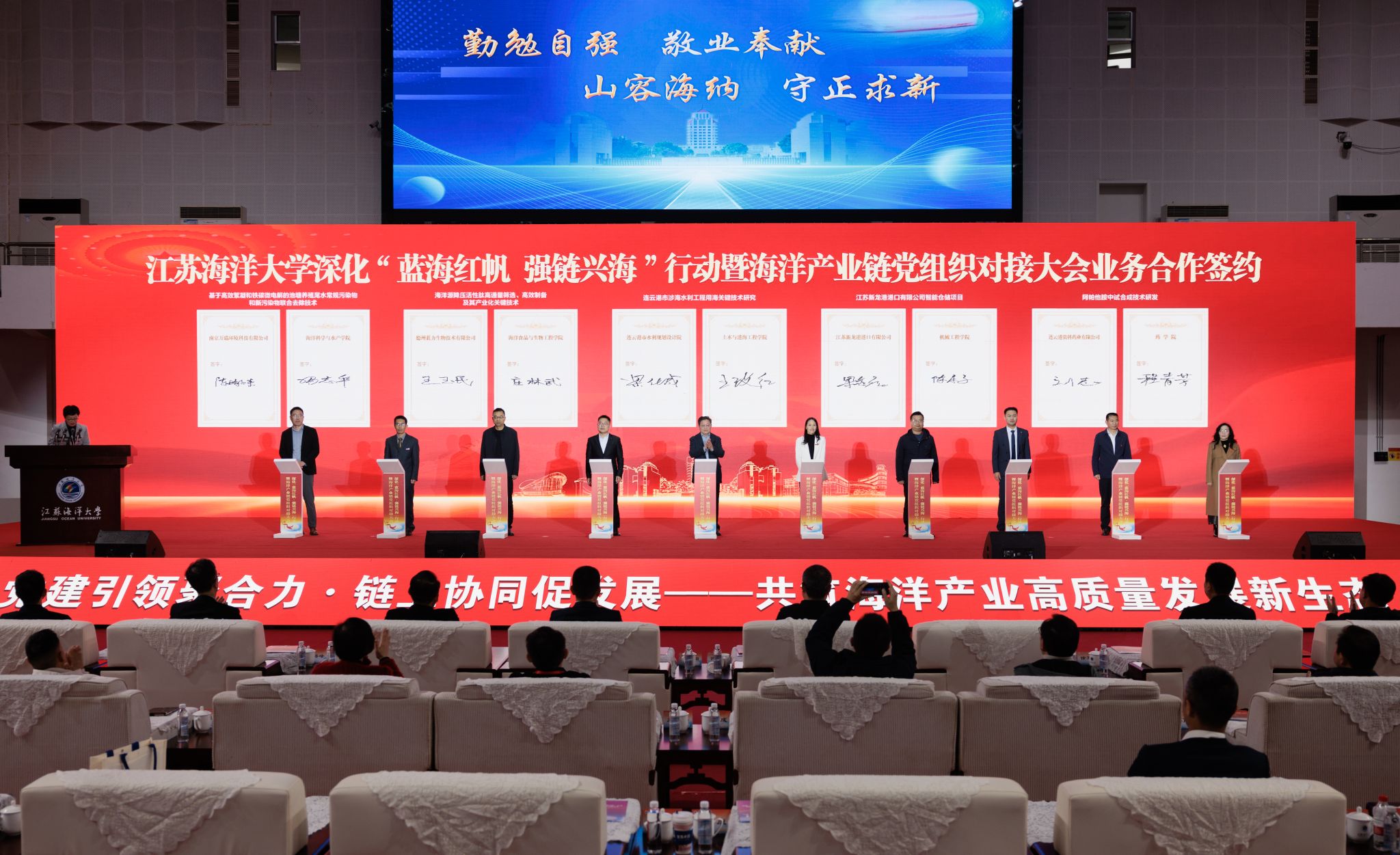 在业务合作签约环节,学校选取10个具有代表性的科研合作项目集中签约,涉及海洋装备、海产品养殖加工、海洋环境保护、海洋医药创新等前沿领域。学校相关单位分别与江苏天明机械集团有限公司、江苏新龙港港口有限公司、南京万瑞环境科技有限公司、德州蓝力生物技术有限公司等企业达成合作。这些项目既是校企深度融合的结晶,更是服务海洋产业高质量发展的具体实践。