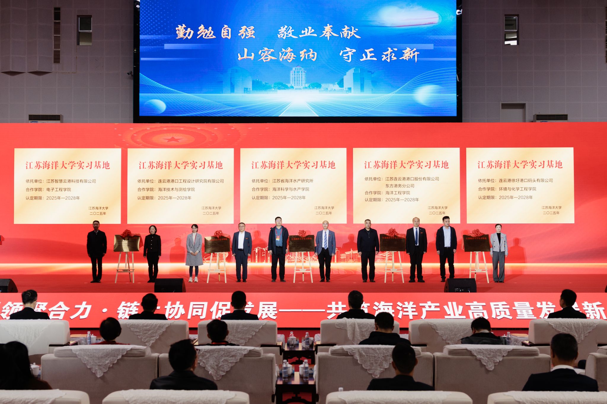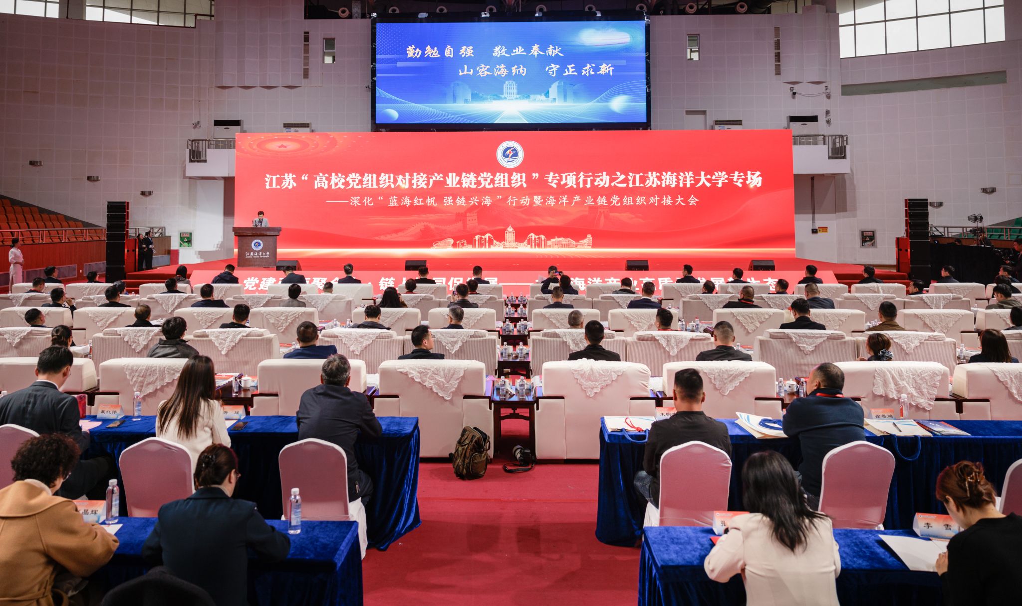 11月15日,江苏海洋大学深化“蓝海红帆 强链兴海”行动暨海洋产业链党组织对接大会在苍梧校区体育馆举行。本次大会旨在通过党建引领,推动校地校企深度融合,共筑海洋产业高质量发展新生态。校党委书记许峰,江苏省沿海开发集团有限公司党委书记、董事长、总经理周金阳,校党委副书记李梅英,副校长申欣、徐军田出席大会。大会由李梅英主持。