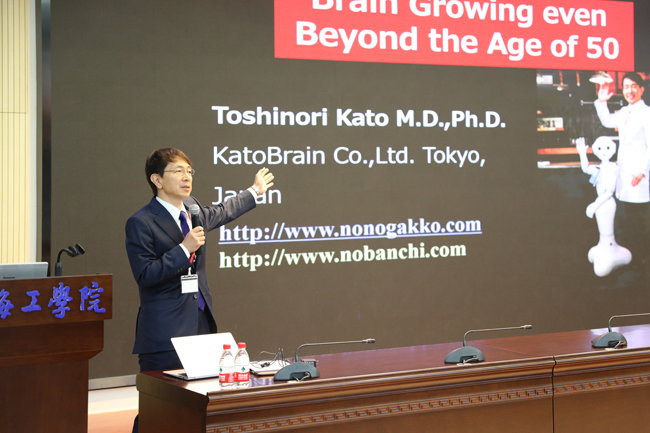 卡托恩有限公司(KatoBrain Co. Ltd.)首席执行官、日本东京昭和大学医学院(School of Medicine, Showa University)客座教授Toshinori Kato博士作题为Brain Growing even Beyond the Age of 50的主旨报告。报告指出,人类大脑在人的一生中不断发育、生长,大脑在出生时是不成熟的,即使人活到了100岁,它仍然是一个不成熟的器官。近50年来,百岁老人的数量增长了400倍以上。即使寿命延长,人类也并不知道如何为100年的寿命培养大脑。报告围绕一种大脑训练方法,详细探讨和分析如何使超过80岁的大脑也能够一天天地成长。