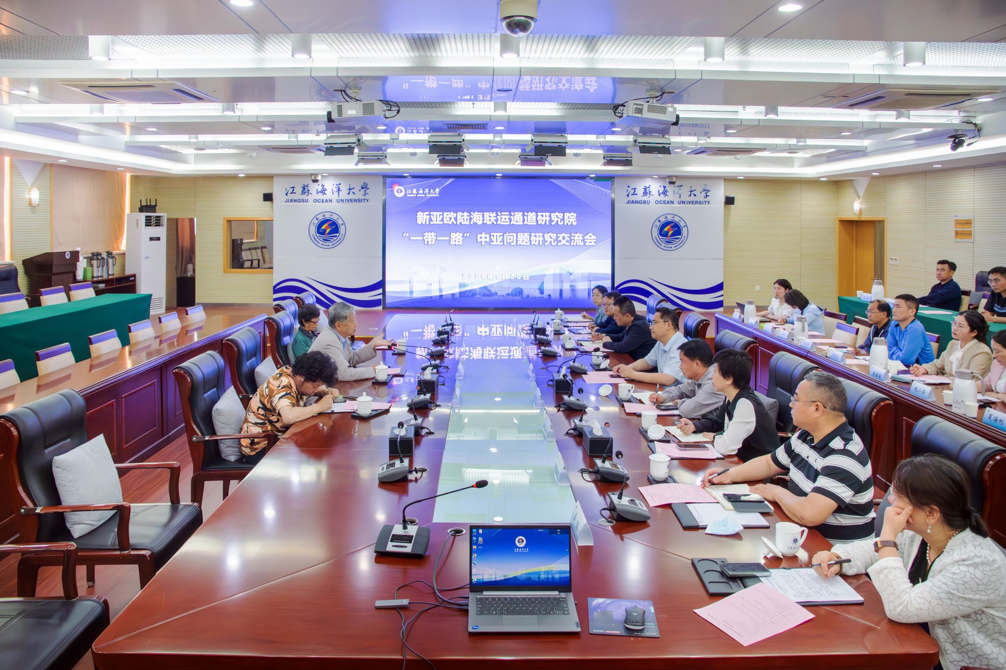 2024年5月20日下午,新亚欧陆海联运通道研究院邀请了兰州大学原副校长,现中亚研究所所长杨恕教授和清华大学“一带一路”战略研究院院长助理池昊涵在校学术中心东海厅举办了主题为“深化学术交流,共促‘一带一路’发展”学术交流会。江苏海洋大学副校长、新亚欧陆海联运通道研究院院长申欣主持会议。校相关职能部门、相关学院领导以及教授、副教授、博士等50多人参会,共同探讨了“一带一路”倡议下的亚欧陆海联运通道建设、区域经济发展及法律服务等议题。