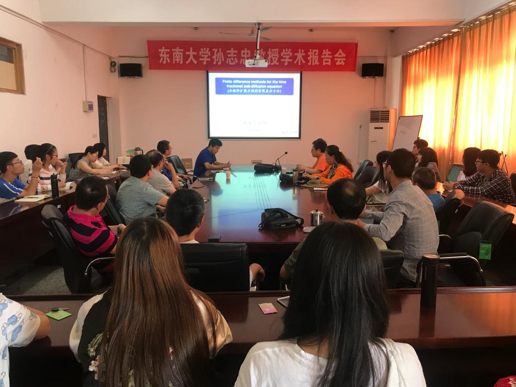 6月12日上午,应理学院邀请,东南大学孙志忠教授在文渊楼理学院会议室做了题目为“分数阶扩散方程的有限差分方法”的学术报告。并与来自信息与计算科学、数学与应用数学、统计学等相关专业的教师和学生代表进行了学术交流,学术交流会由理学院副院长吕小光主持。