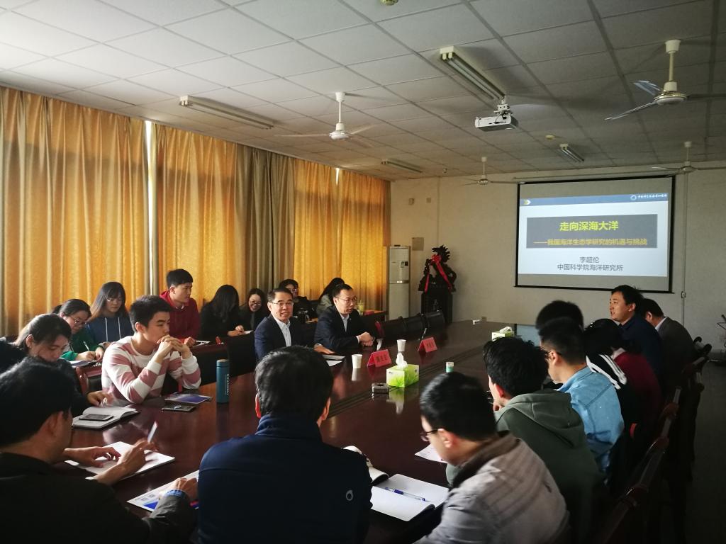 4月26日上午,中国科学院海洋研究所李超伦副所长应邀在海洋楼会议室,以《走向深海大洋——我国海洋生态学研究的机遇与挑战》为题作了精彩学术报告。副校长陈先宏主持报告会,海洋生命与水产学院相关专业教师和研究生40余人聆听了报告。