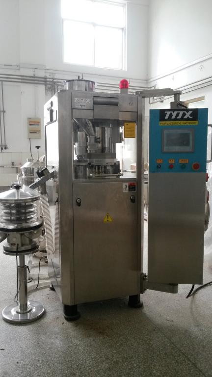 高压旋转式压片机是一种自动旋转连续压片的机器,是制药、化工、食品等工业部门,处理各种颗粒状原料压制成片剂的基本设备。本机可用于将颗粒状物料自动连续压制成直径不大于20mm的圆形,可用于大量或小批量多品种生产压制圆形的各种药片、糖片、钙片等。通过增配模具,可压制异形和带有文字、符号、图形片状物。压制片状物料为含粉量不超过10%的颗粒。本机不适用于半固体,潮湿颗粒、低熔点易吸湿原料和无颗粒的粉末压片。