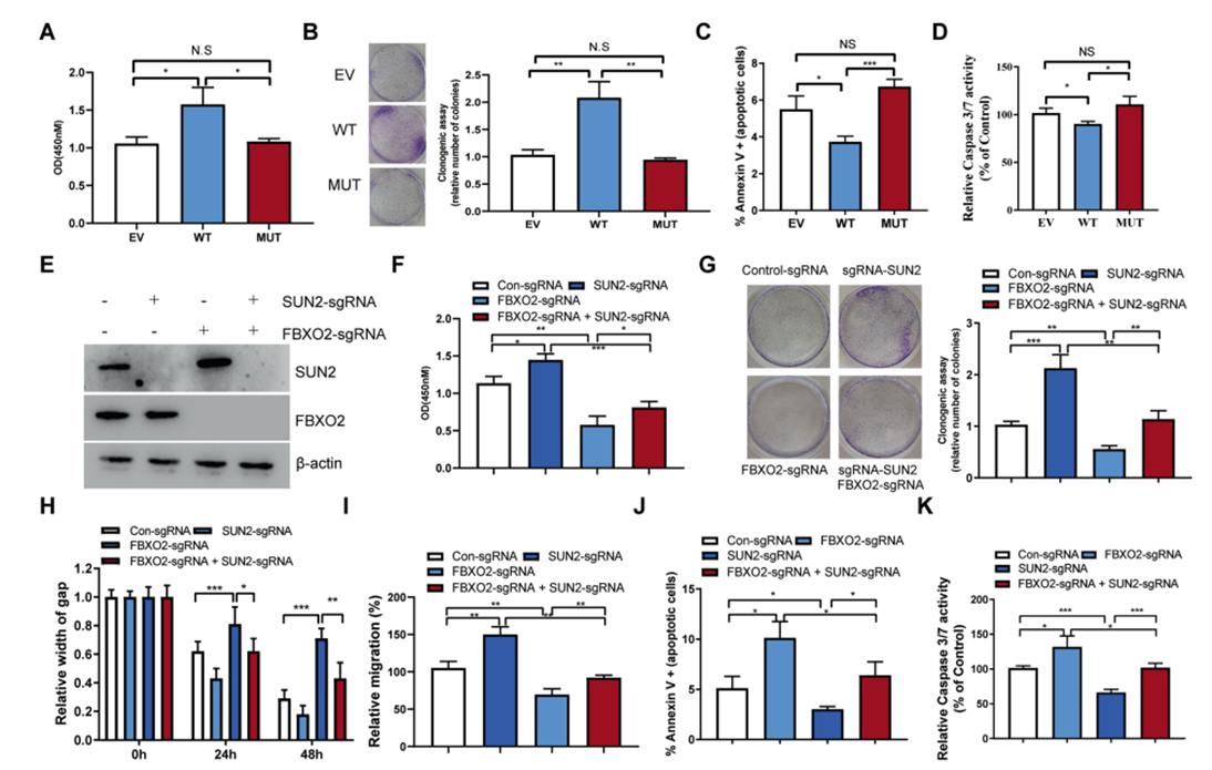 该研究通过进一步机制研究发现转录因子SOX6能够上调FBXO2的表达,促进了抑癌基因SUN2的降解,抑制了细胞凋亡,并激活了多种促细胞增殖的信号通路而诱导卵巢癌的进展。此外,该研究还证明了FBXO2靶向降解SUN2蛋白高度依赖于SUN2的糖基化修饰,揭示了蛋白质翻译后修饰的交互作用在控制SUN2蛋白质稳定性中的分子机制。