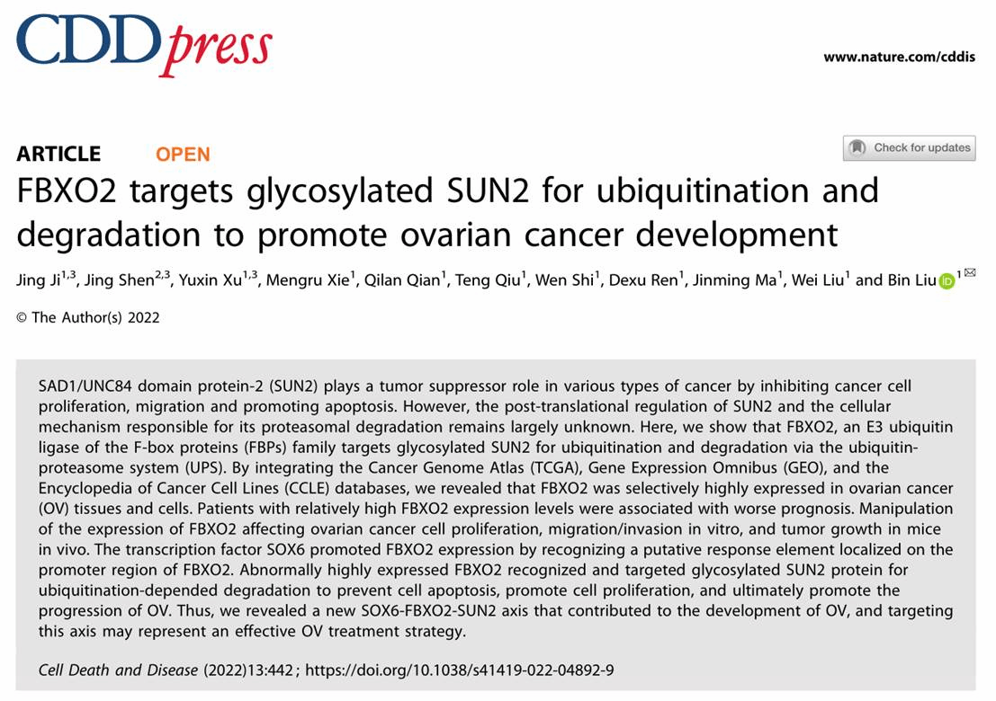 5月7日,药学院副院长,江苏特聘教授刘彬团队以江苏海洋大学为论文第一完成单位和通讯单位在Nature旗下著名学术期刊《Cell Death & Disease》(2021影响因子8.469)在线发表题为“FBXO2 targets glycosylated SUN2 for ubiquitination and degradation to promote ovarian cancer development”的高水平研究性论文。该团队成员吉敬博士为论文第一作者,刘彬教授为唯一通讯作者。长江大学附属荆州医院妇产科副主任沈晶博士与我院硕士研究生徐誉芯为共同第一作者,硕士研究生谢梦如、钱其兰、邱腾、施雯、任德续参与了部分工作。