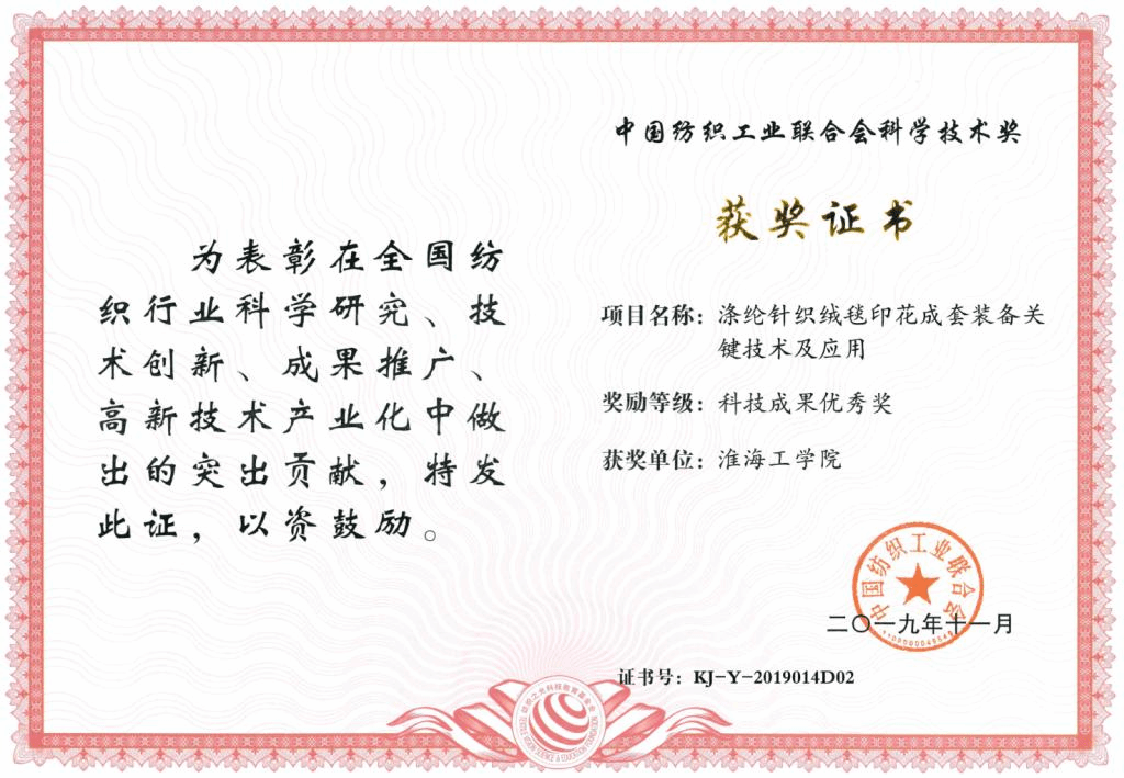 由中国纺织工业联合会主办,纺织之光科技教育基金会协办的“纺织之光”2019年度中国纺织工业联合会科学技术奖日前揭晓。我校“先进材料与装备”科研团队参与申报的科技成果——“涤纶针织绒毯印花成套装备关键技术及应用”荣获科技成果优秀奖。该成果创新性地开发了一种全自动干燥固色一体化系统和一套多循环低耗能的水洗系统,提高了固色的稳定性和水洗轧辊的耐疲劳性。项目成果在江苏鹰游纺机有限公司成功应用两年以来,已取得了较为显著的经济效益和社会效益。